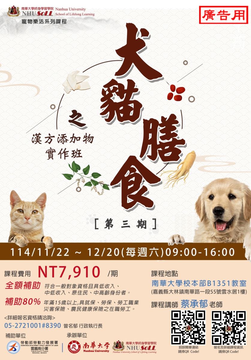 | 課程名稱: | 犬貓膳食之漢方添加物實作班第03期 | | 授課教師: | | | 上課日期: | 2025-11-22~2025-12-20 | | 上課時間: | 09:00~16:00 | | 上課地點: | 南部南華大學成均館C320教室 | 課程費用: | | | 課程說明如下 |
